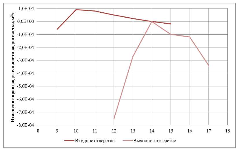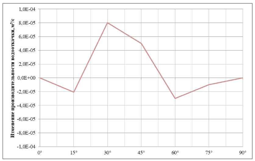На рис. 5 представлены результаты моделирования с различными углами фаски, расположенной на входе отверстия. Для повышения наглядности, на данном графике демонстрируется изменение производительности водооткачки. Наибольший положительный эффект наблюдается при угле фаски 30°.