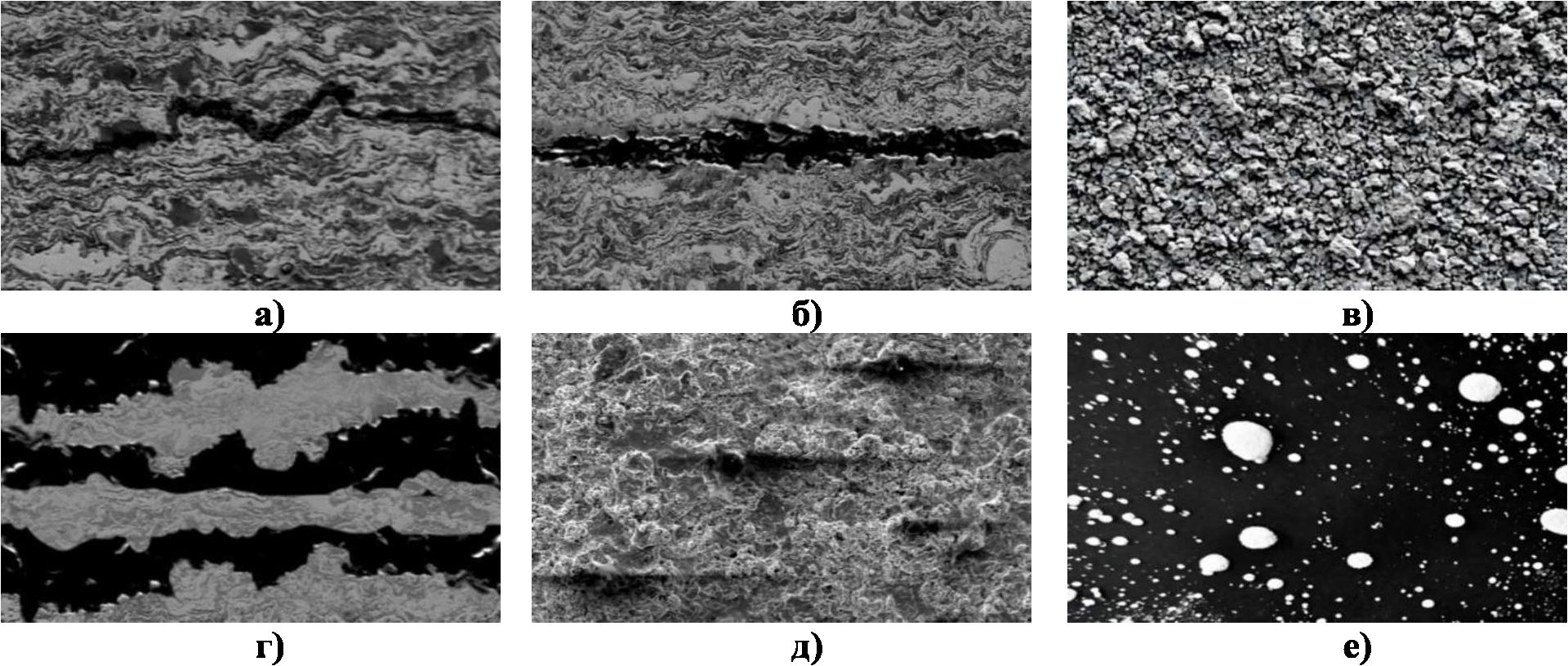 Рис. 1. Примеры распространенных дефектов композиционных покрытий: а) трещины; б) отслоение; в) пористость; г) неравномерность толщины; д) образование геля; е) контаминация