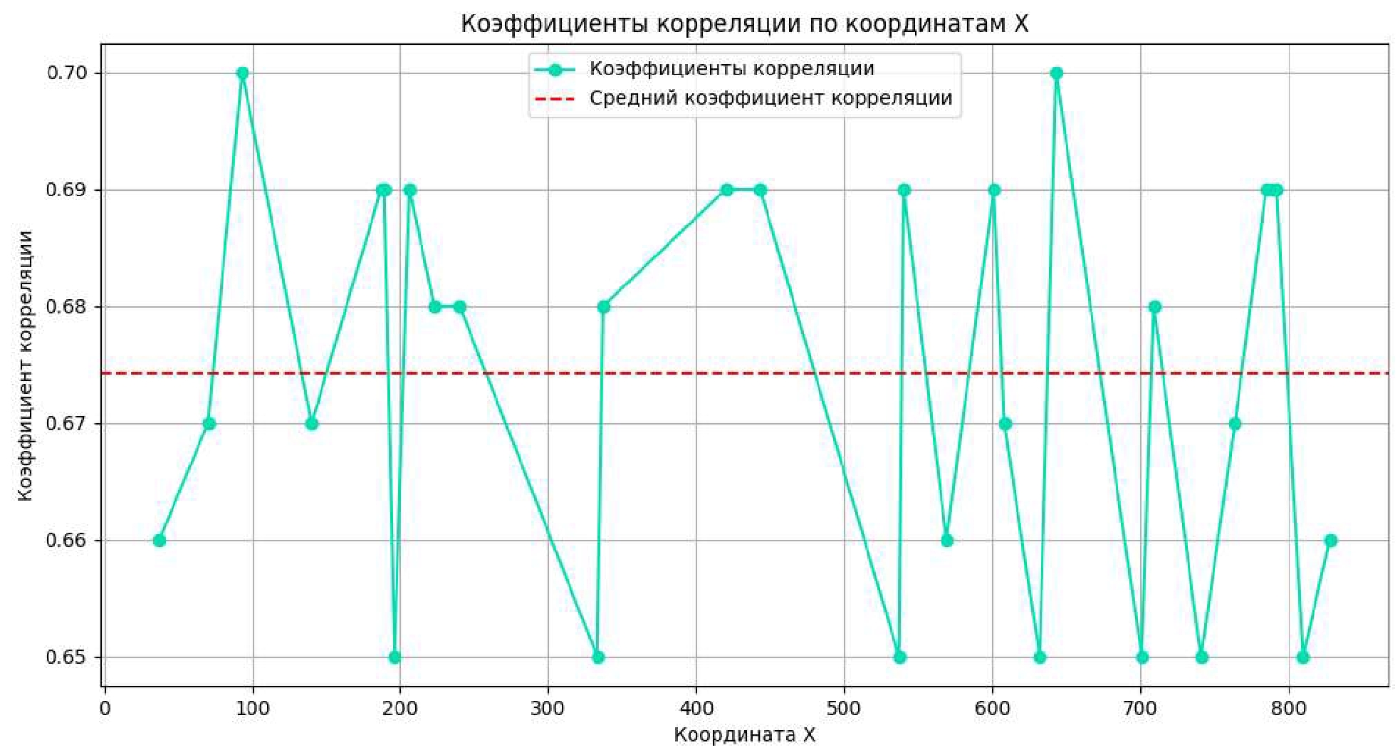 Положительное значение r, близкое к 1, свидетельствует о высоком сходстве участков, т.е. об отсутствии дефектов. На рис. 2. представлен график коэффициентов корреляции при сравнении двух изображений покрытий.