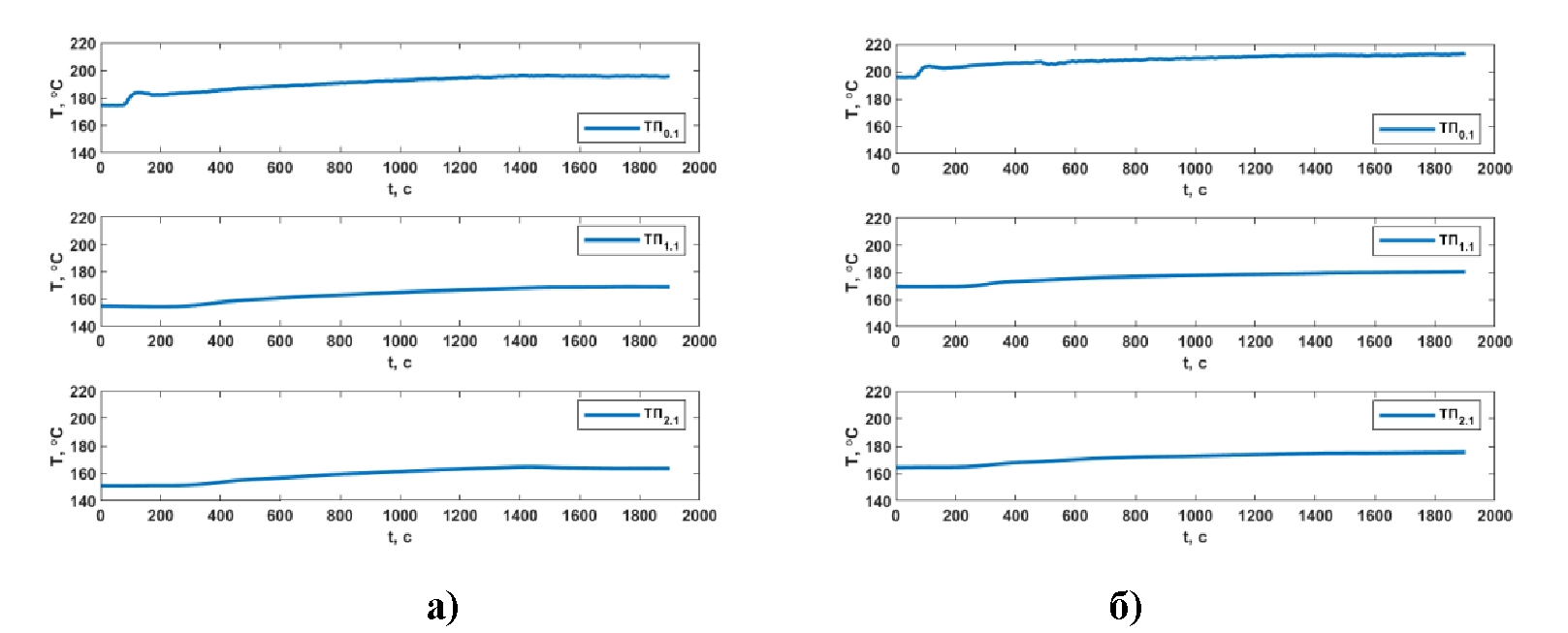 При увеличении мощности тепловыделения до 2,7 кВт температура на выходе из источника тепла составляет 195 °C. Температуры на входах в ТВС составляют значения, колеблющиеся в диапазоне 163-164 °C (рис. 4а). На рис. 4б показана зависимость от времени температур теплоносителя после источника теплоты и на выходе из обеих петель при мощности энерговыделения в ТВС равной 3,6 кВт. Сохраняется период установления циркуляционного течения длительностью около 25 мин. В установившемся режиме температура на выходе из обоих петель находится в диапазоне 173-175 °C, на выходе из источника теплоты: 212 °C.