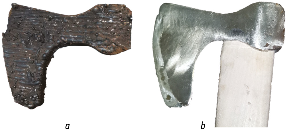 6. Рис. 5. Реплика средневекового топорища, выращенная по технологии электродугового выращивания с помощью СПРУТКАМ: a ― заготовка до механической обработки; b ― заготовка после механической обработки.
