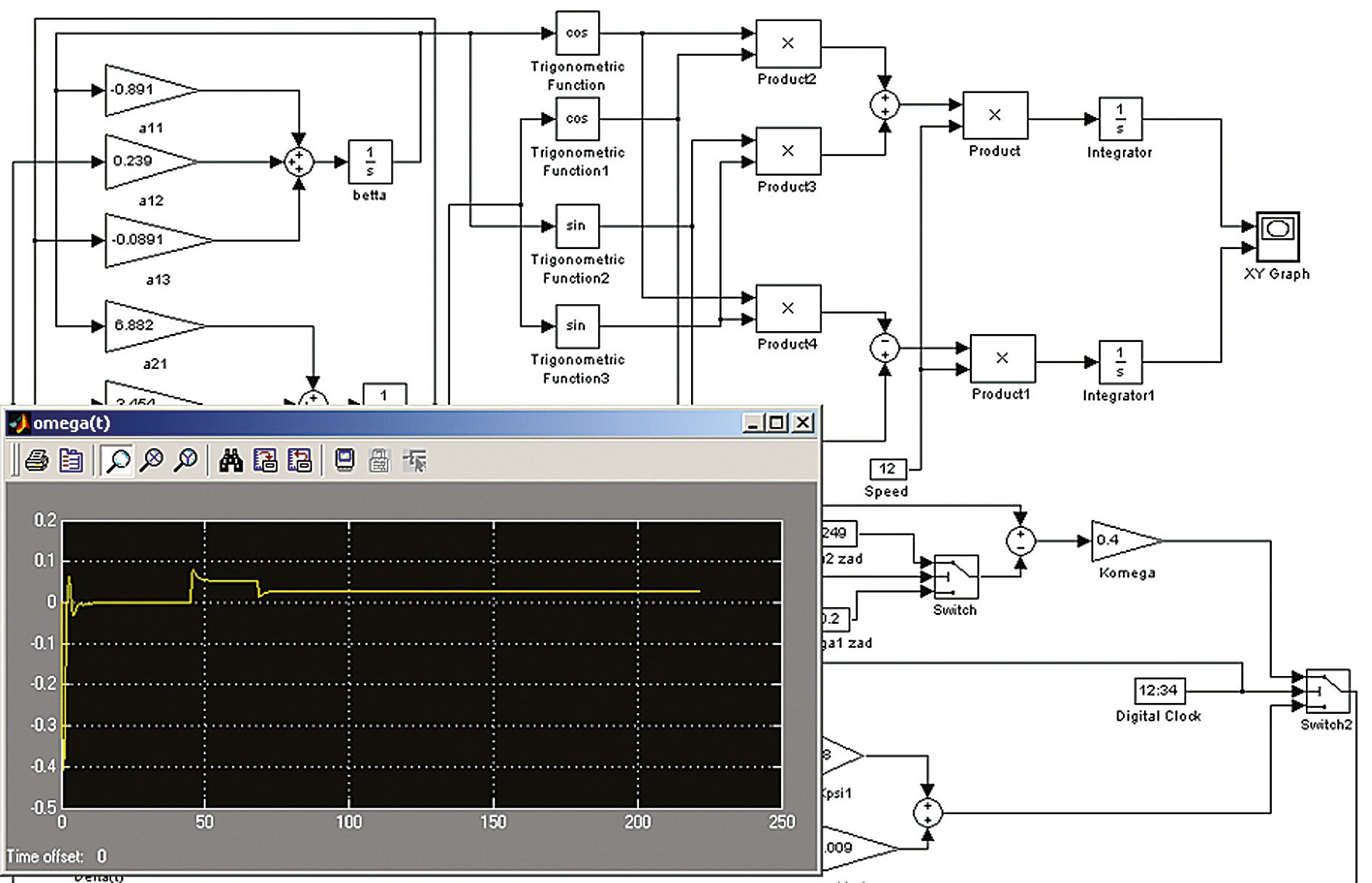 Используя измеряемые параметры нелинейных функций управления движением БК при моделировании сложных траекторий, реализуемых БК, можно получить структурную схему моделирования с нелинейными статическими характеристиками измерителей информации о курсе и угловой скорости БК, а также следующие результаты исследования модели системы управления движением БК (рис. 9 и 10) [4].