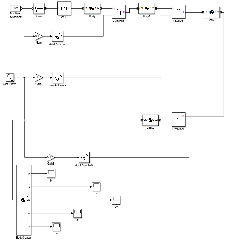 Схема, показанная на рис. 3, моделирует поведение манипулятора, состоящего из четырех идеальных твердых тел («Плечо» — блок Body, «Предплечье» — Body1, «Кисть» — Body2, «Захват» — Body3). Манипулятор приводится в движение одной цилиндрической и двумя угловыми передачами. Блоки Joint Actuator необходимы для передачи управляющего усилия на передачи, моделируя, таким образом, приводной двигатель. Блок Body Sensor позволяет получит координаты, скорость, линейные и угловые ускорения захвата.