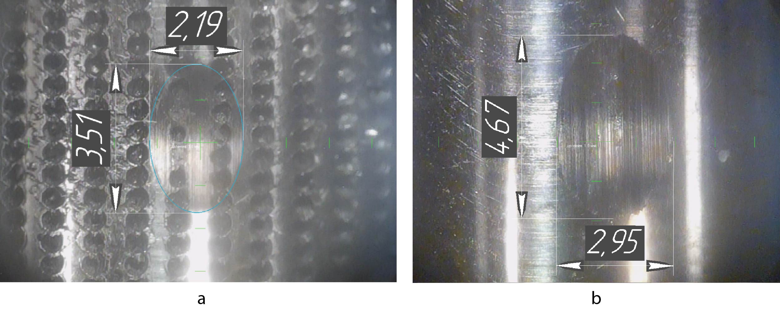 Предполагается, что это связано с тем, что по мере увеличения площади поверхности, занимаемой ямками, и увеличением их плотности фактическая поверхность контакта уменьшается, что приводит к увеличению фактического контактного давления на поверхности скольжения, что оказывает отрицательное влияние на фрикционные свойства. Для образцов с ямочками размером 120 мкм пятно контакта 1,68 на 2,95 мм (рис. 4).