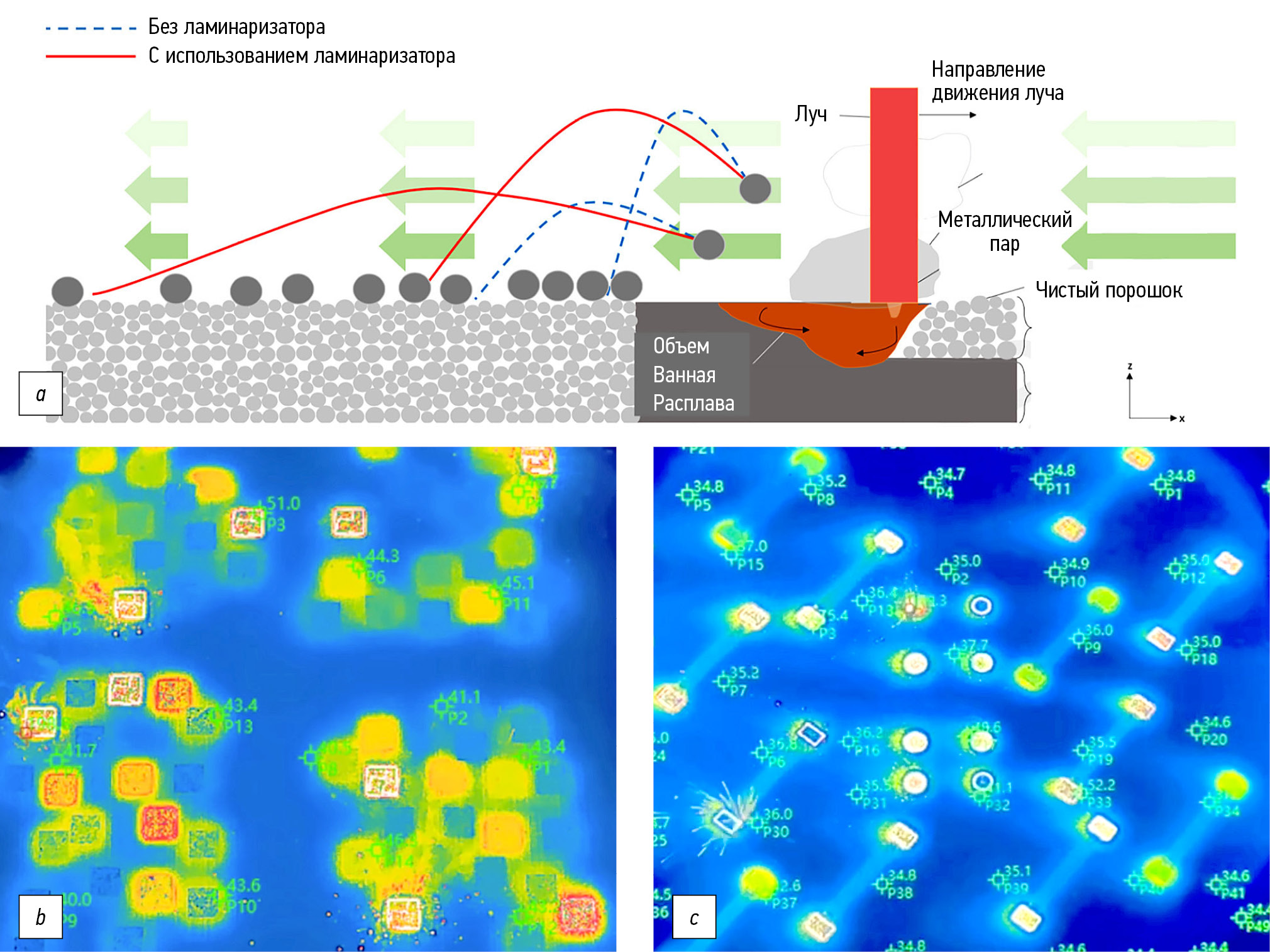 Рис. 5. Схема профилей выброса брызг из ванны расплава и влияние газового потока на траектории (а), изображение получено с помощью тепловизора [2]; без ламинаризатора (b); с использованием ламинаризатора (c).