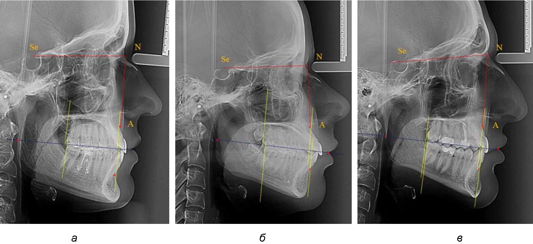 Рандомизация телерентгенограмм при физиологической окклюзии (1-я группа) проводилась по принципу распределения с учетом позиции верхней челюсти, определяемой по величине угла A-N-Se.
