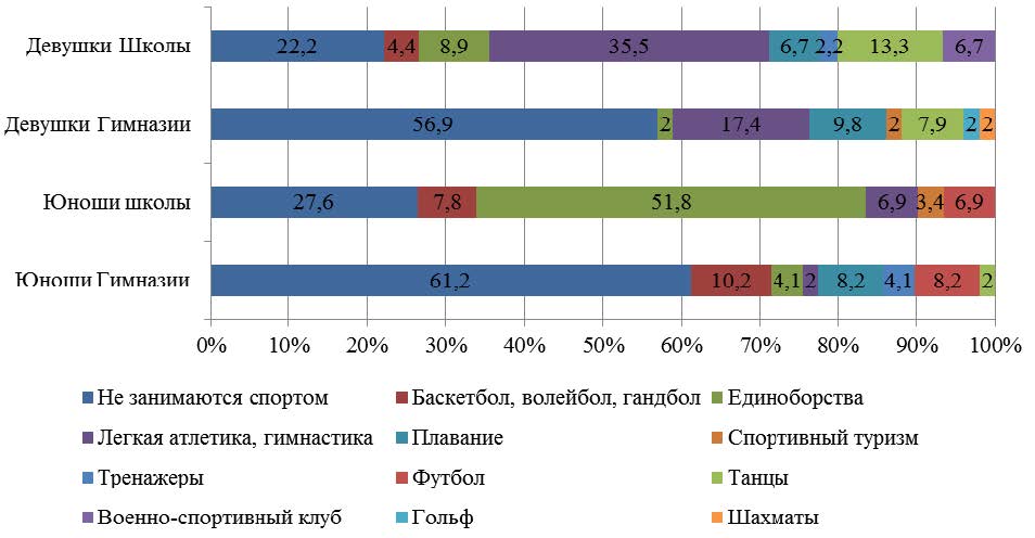 В спецгруппе занимаются 17,6 % гимназистов и лишь 1,4 % школьников, что, вероятно, обусловлено худшими показателями здоровья этой категории подростков.