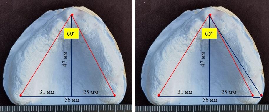 Слева диагональ дуги составила 53 мм, что на 3,5 мм меньше оптимального размера и свидетельствовала об аномалии формы и размера. Построение диагностического равностороннего треугольника способствовало нормализации величины центрального угла и подчеркивало асимметрию альвеолярной дуги.