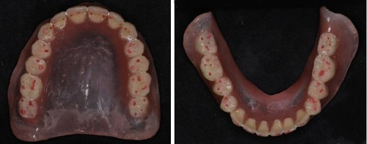 Несмотря на наличие перекрестной окклюзии при проведении функциональных проб, протезы не балансировали в полости рта и не требовали специальных гелей для улучшения их фиксации.