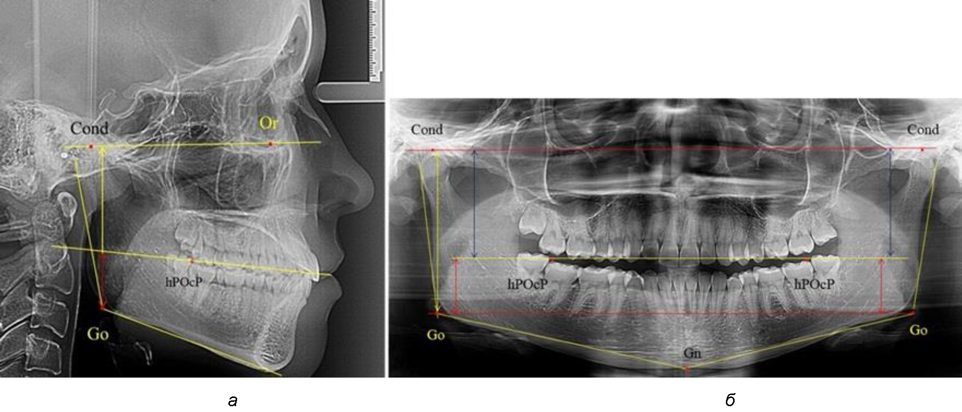 На боковых телерентгенограммах определяли положение верхней точки суставной головки Cond. Касательные линии к ветви и телу нижней челюсти пересекались в точке, которую в клинической практике обозначают как точка угла нижней челюсти или точка гонион Go. Точкой hPOcP обозначали дистальный бугорок нижнего второго моляра вблизи окклюзионного контура коронки, через нее от межрезцовой точки проводили окклюзионную линию, ее продолжали до задней части ветви челюсти. Высоту ветви измеряли как расстояние от угла нижней челюсти до вершины суставной головки Go-Cond. Общую высоту ветви условно делили на 2 части, ее границей служила окклюзионная линия. Верхнюю часть обозначали как окклюзионно-суставная, а нижнюю – как окклюзионно-гониональная.