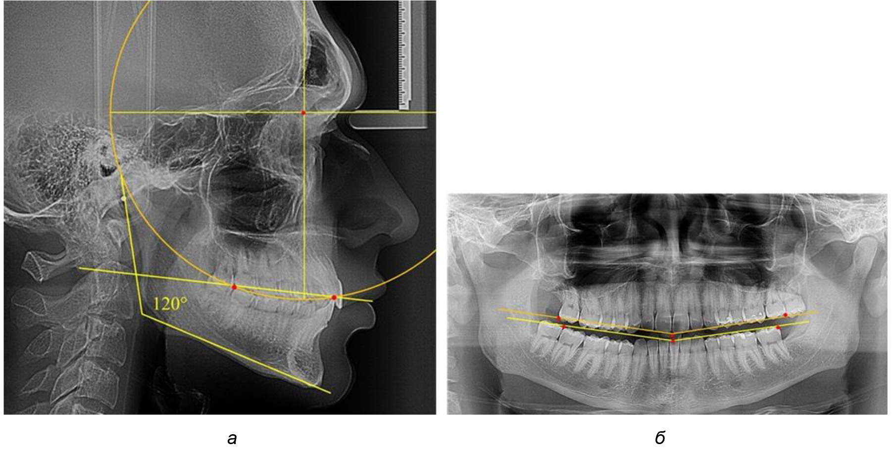 Рис. 2. Особенности кривой Spee на ТРГ (а) и ОПТГ (б) у людей с признаками вертикального роста
