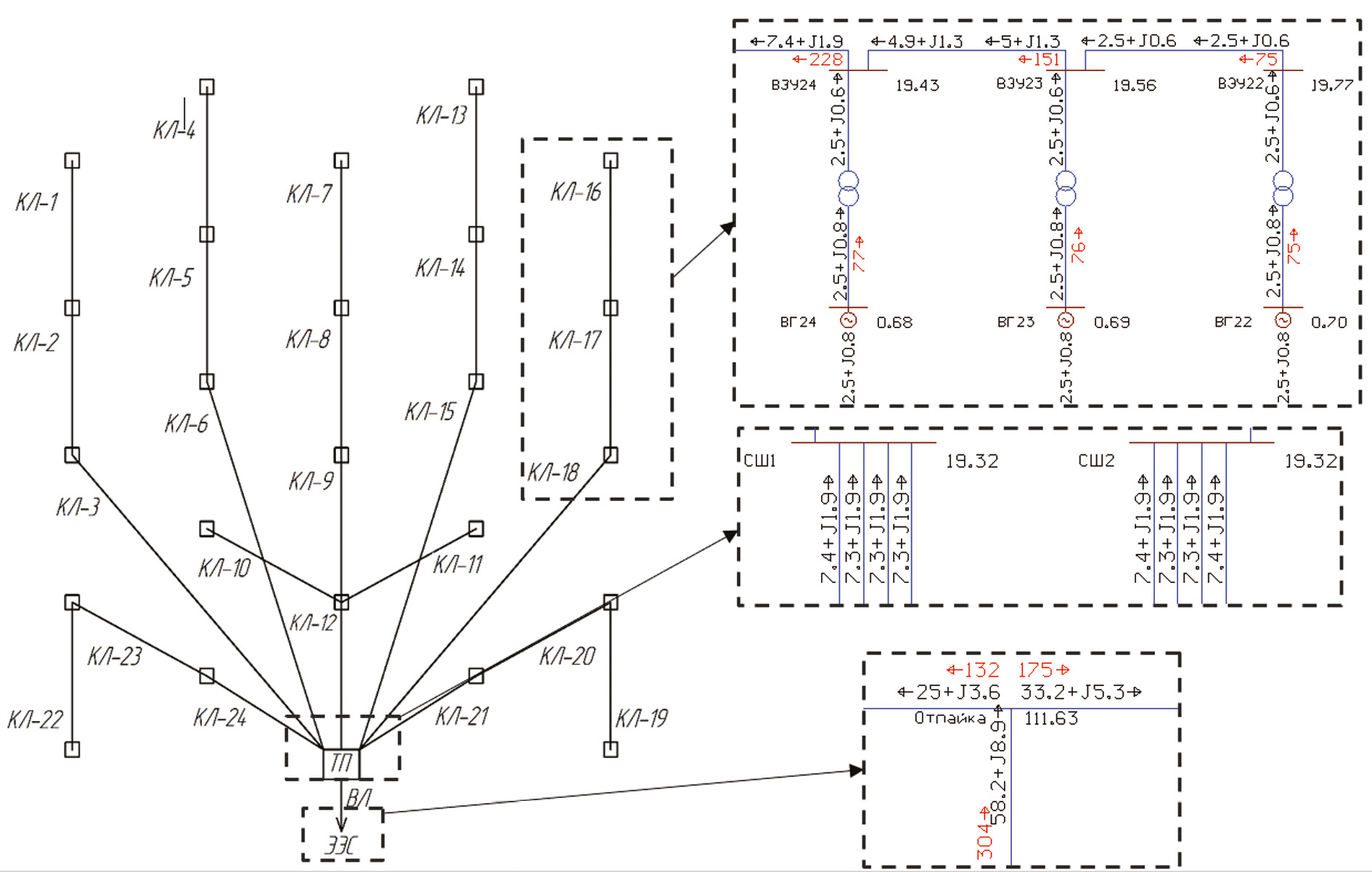 Рис. 1. Коллекторная сеть ветропарка и фрагментарные выноски его максимального режима работы