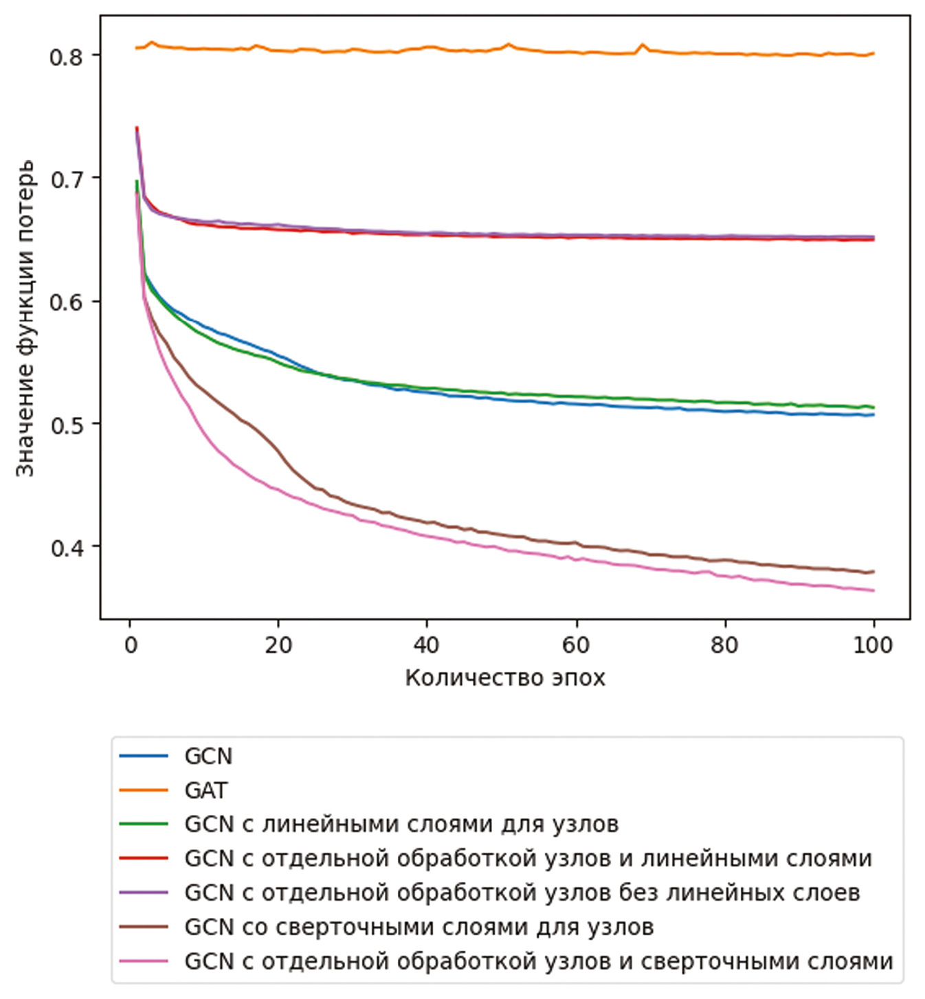 Рис. 3. График функции потерь для различных моделей графовых нейронных сетей