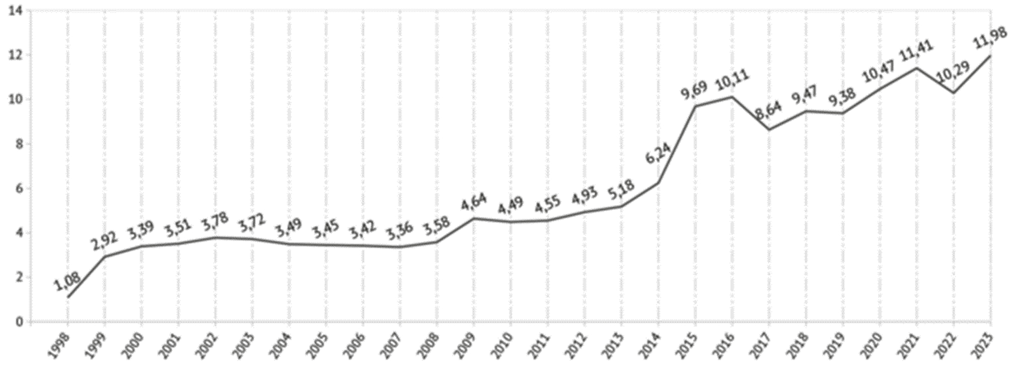 Рис. 2. Динамика курса юаня по отношению к рублю в 1998–2023 гг.