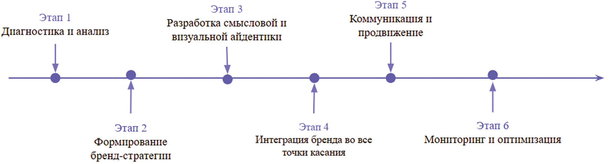 Для успешной реализации стратегии брендинга университетов рекомендуется использовать Roadmap, состоящую из шести взаимосвязанных этапов (рис. 1). При этом очень важно четкое определение целей, задач и KPI для каждого этапа.