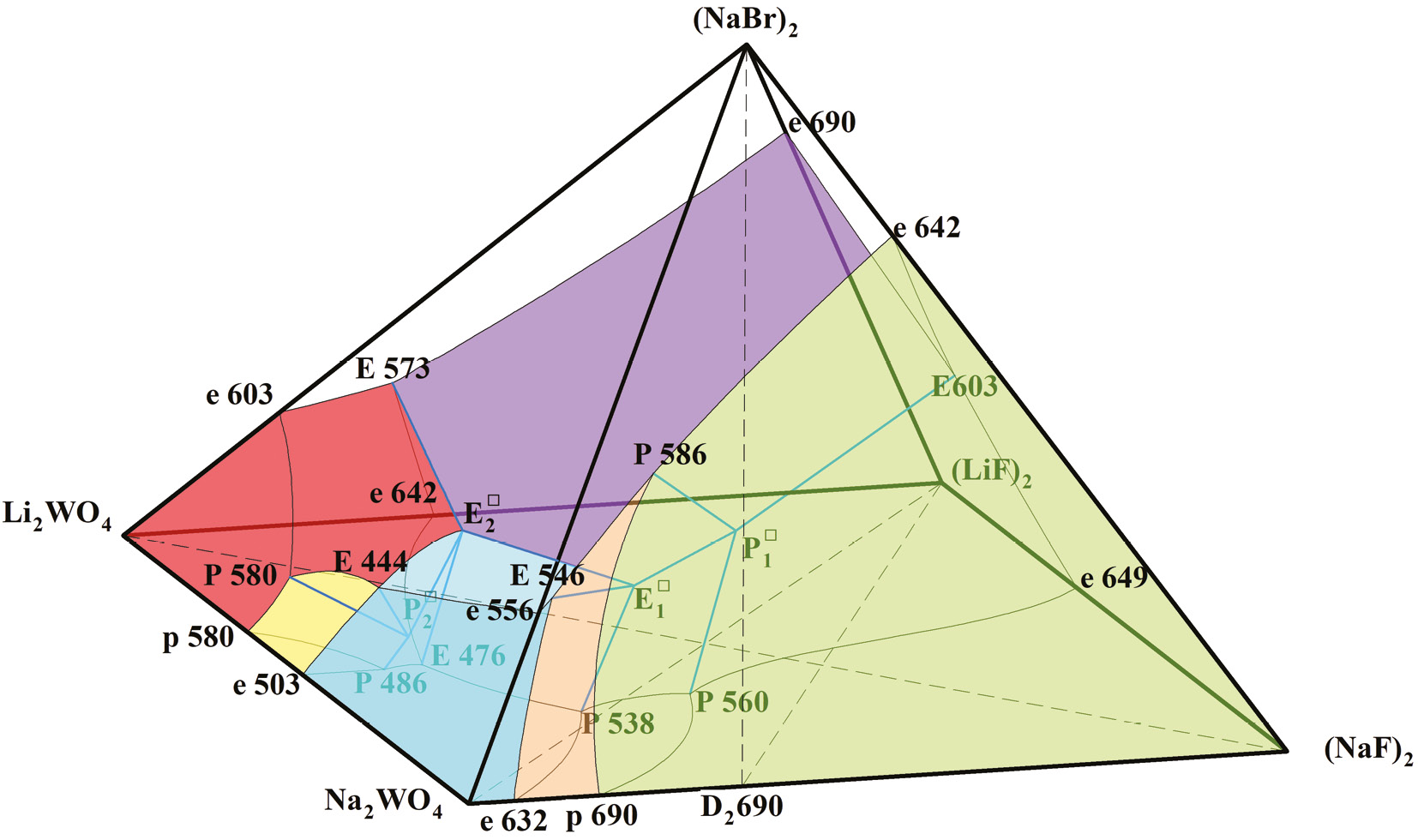 Методы. Для системы Li+, Na+ || Br-, F-, WO42- была составлена развертка граневых элементов на основе литературных данных [1]. При изучении многокомпонетных систем получают древо фаз. Для изучаемой системы древо фаз представляет собой совокупность стабильного тетраэдра и стабильного пентатопа. Стабильный пентатоп NaBr-Li2WO4-Na2WO4-LiF-NaF может быть исследован как отдельная квазичетырехкомпонентная система. Подобная сложная система изучена при помощи схемы моновариантных равновесий [2], она позволила выявить, какие моновариантные и нонвариантные равновесия реализуются в системе. Был проведен расчет составов и температур плавления для нонвариантных точек в системе. Прогнозирование температур плавления основано на функциональной зависимости температур плавления нонвариантных точек, образующихся в системах меньшей мерности, от числа компонентов [3]. Определение состава проводилось по температурам и составам нонвариантных точек, принадлежащих элементам огранения. Предполагается, что нонвариантная точка квазичетверной системы лежит ближе к нонвариантной точке на элементе огранения с меньшей температурой равновесия. Полученные данные позволили построить фигуры нонвариантных равновесий, из которых были выявлены схемы фазовых реакций. При составлении материального баланса по компонентам были получены коэффициенты для уравнений фазовых реакций (табл. 1).