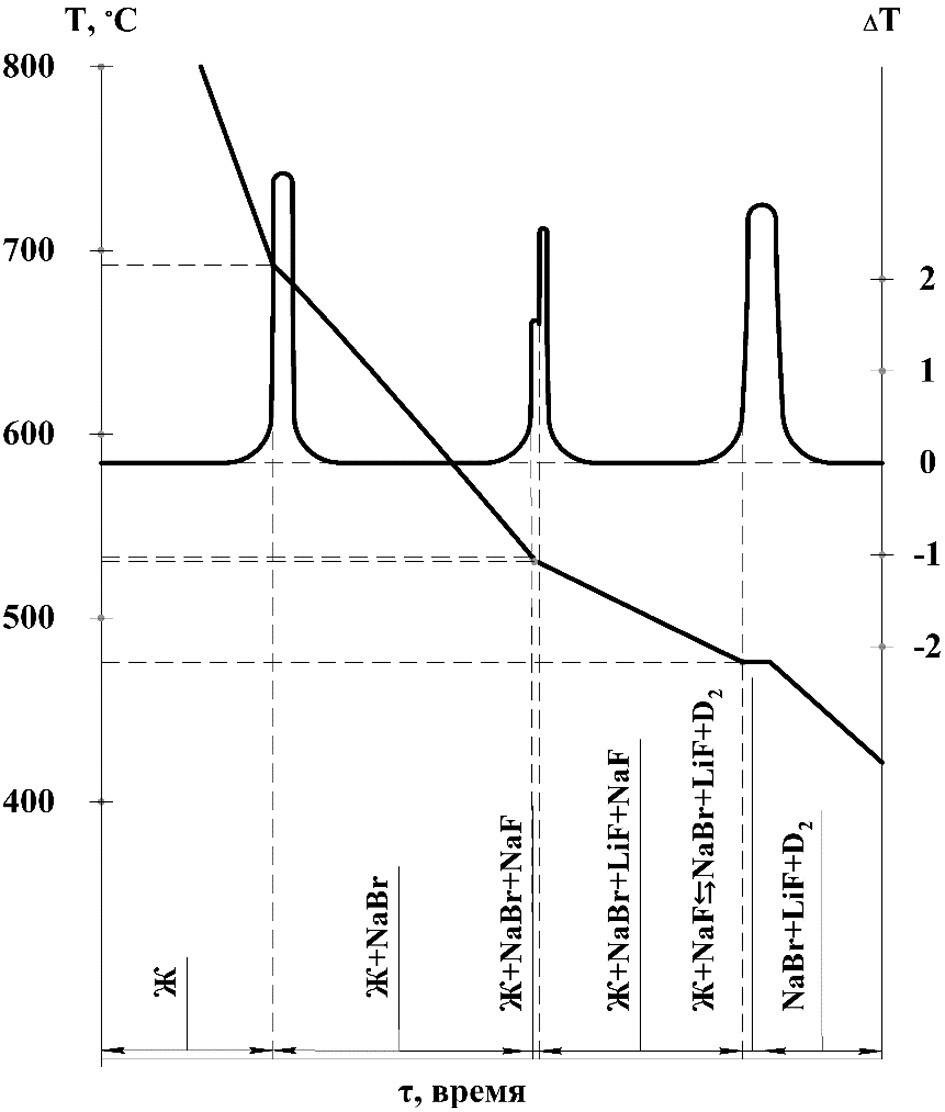 Рис. 2. Смоделированная термограмма охлаждения смеси «а» (5 %экв. LiF + 85 % экв. NaBr + 5 % экв. NaF + 5 % экв. Na2WO4)
