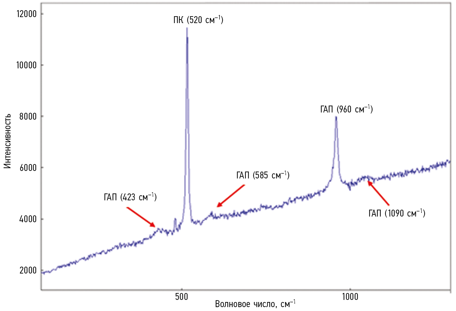 - 1090 см–1 — валентное замещение А-типа для соединения СО3, что соответствует биоматериалу из старой костной ткани.
