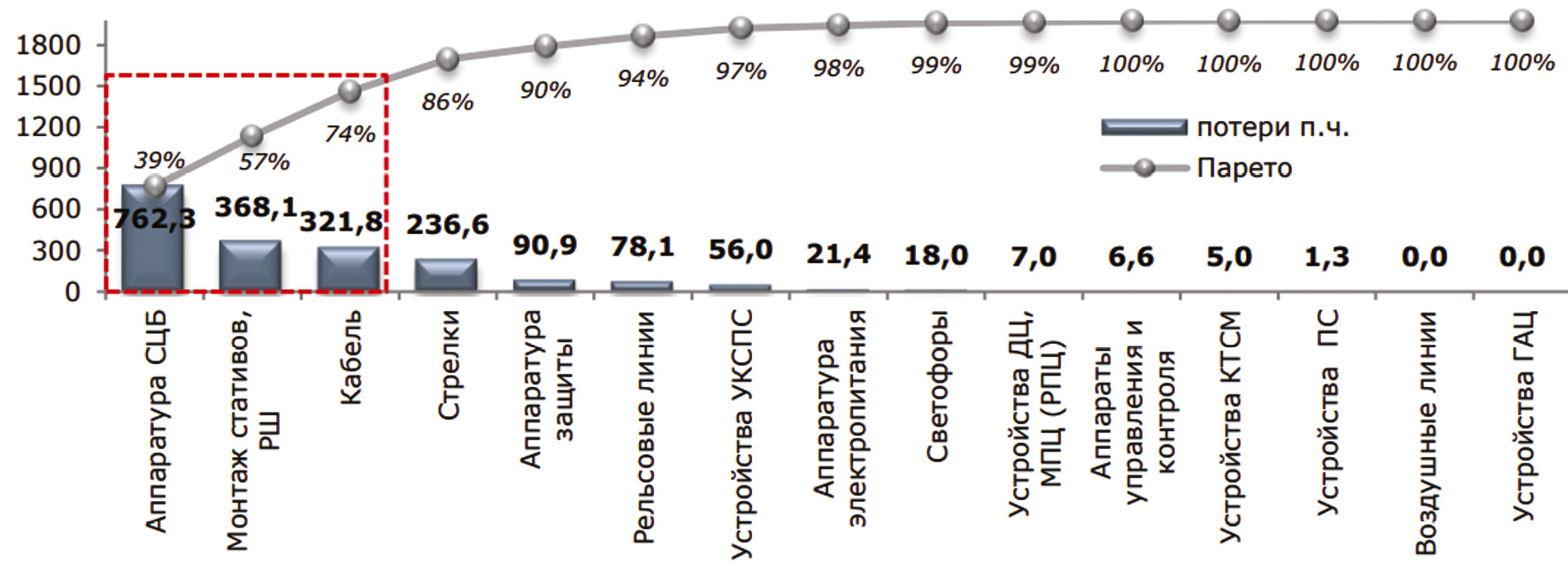 Рис. 1. Распределение Парето отказов технических средств железнодорожной автоматики и телемеханики 1,2 категории по устройствам