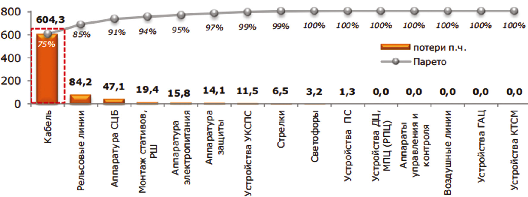 Рис. 3. Распределение Парето потерь поездо-часов от отказов вида «внешние воздействия (кражи, порчи)»